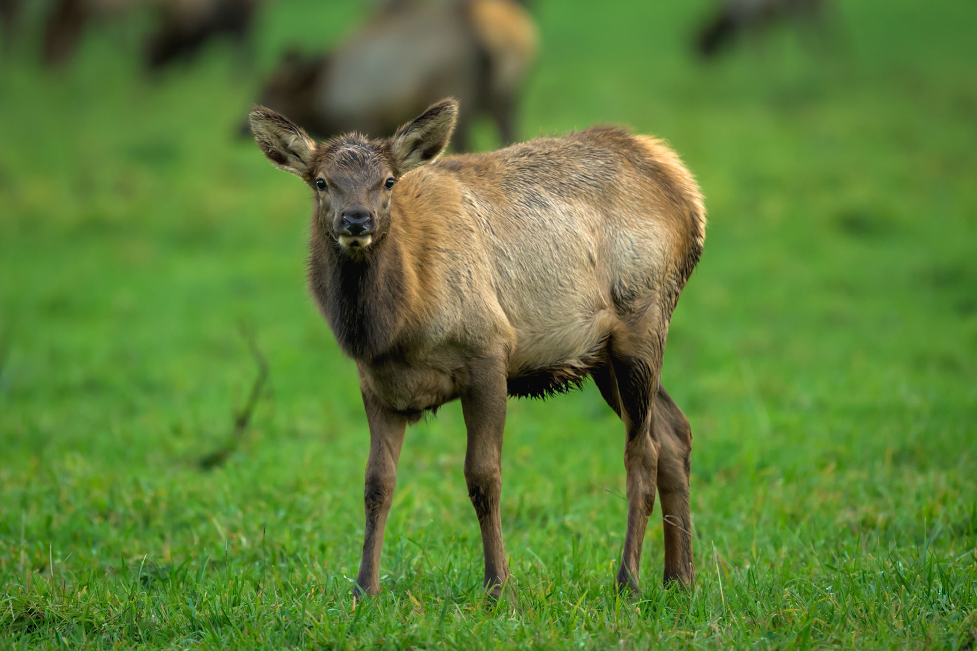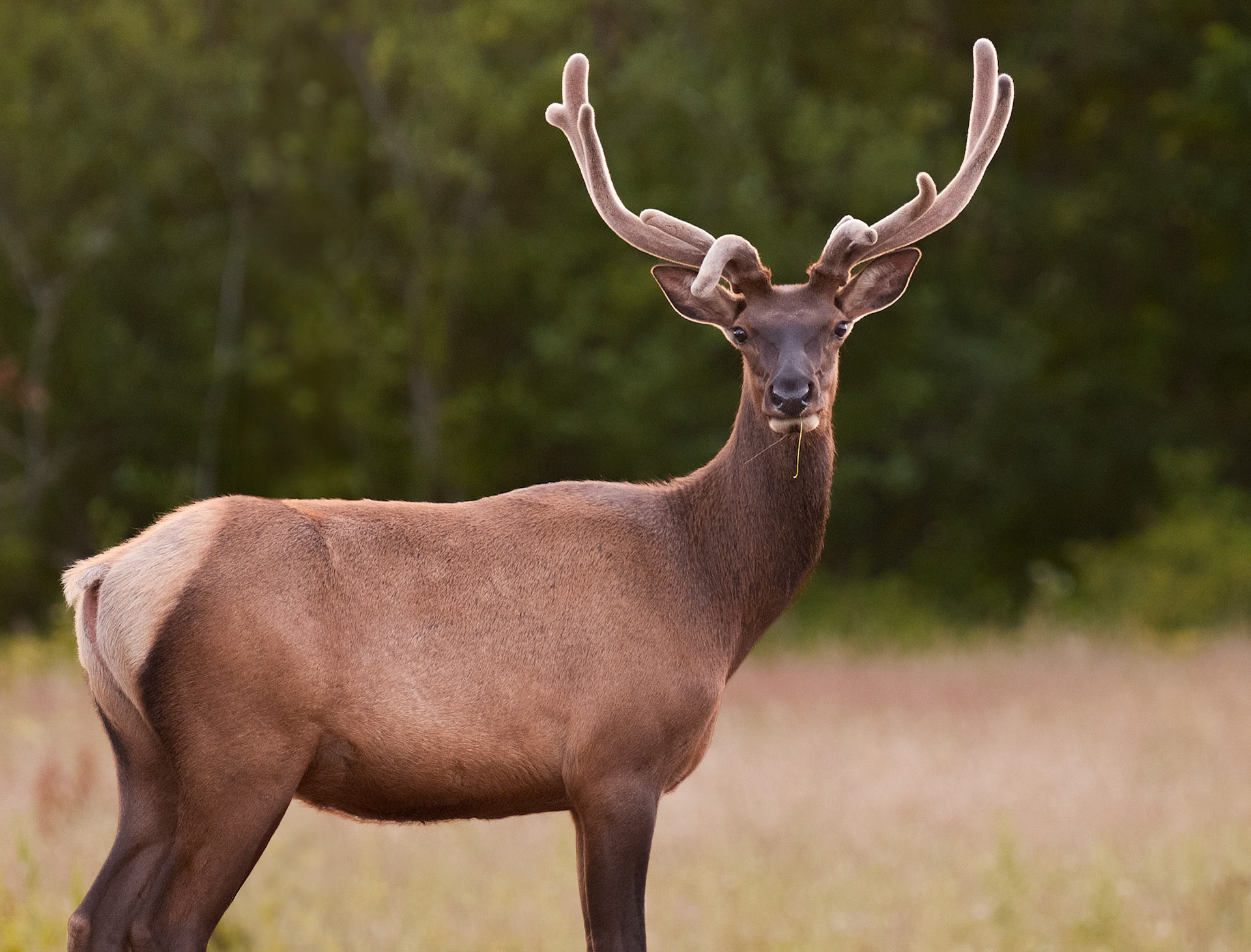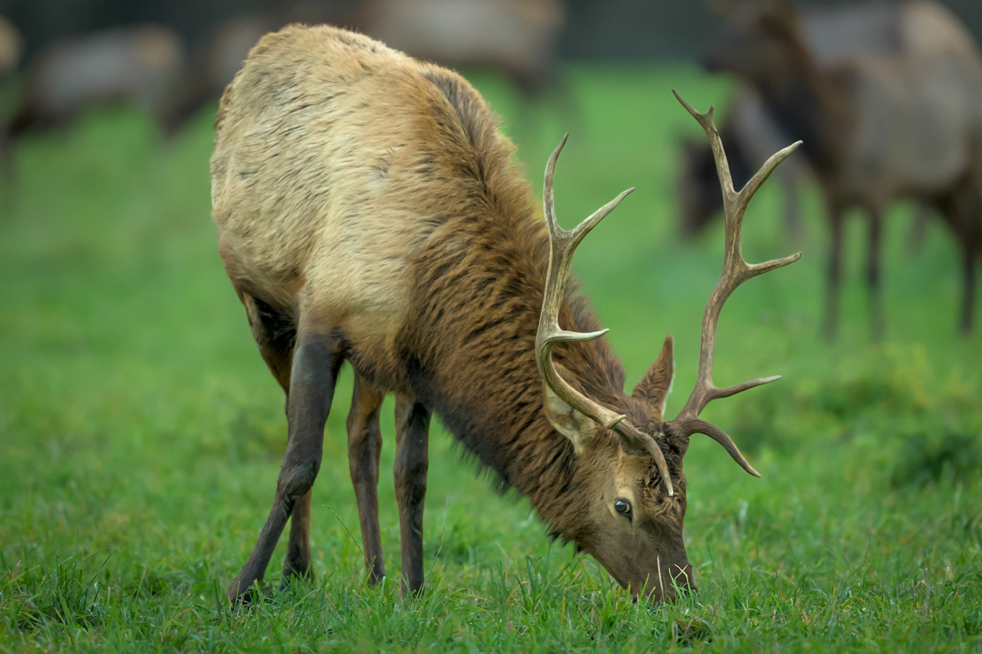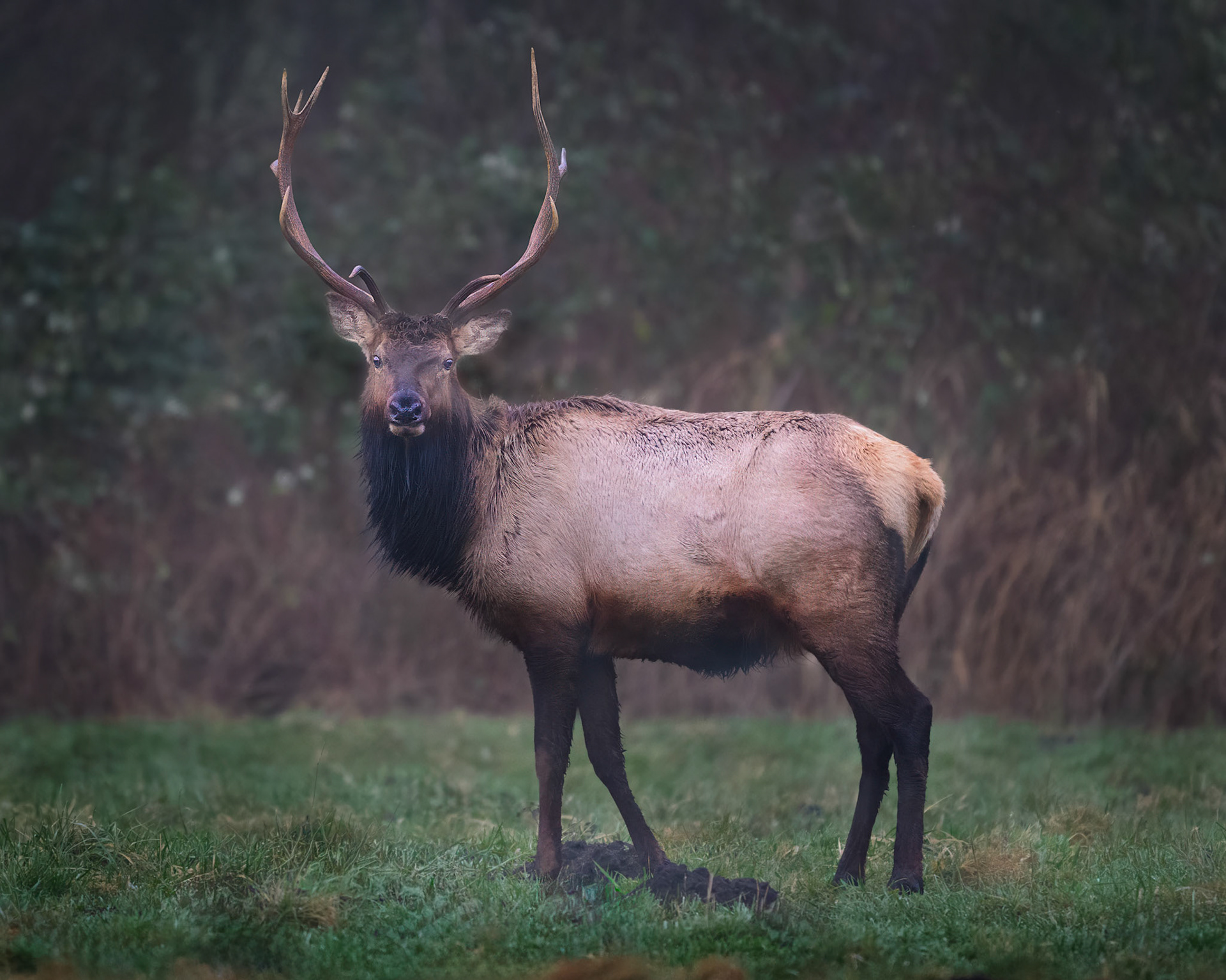 A herd of bull elk stands silently in a misty field at dawn, their velvet-covered antlers silhouetted against the soft blue haze. Captured in the stillness of early morning, this photograph evokes the quiet strength and natural harmony of these majestic creatures in their wild domain.