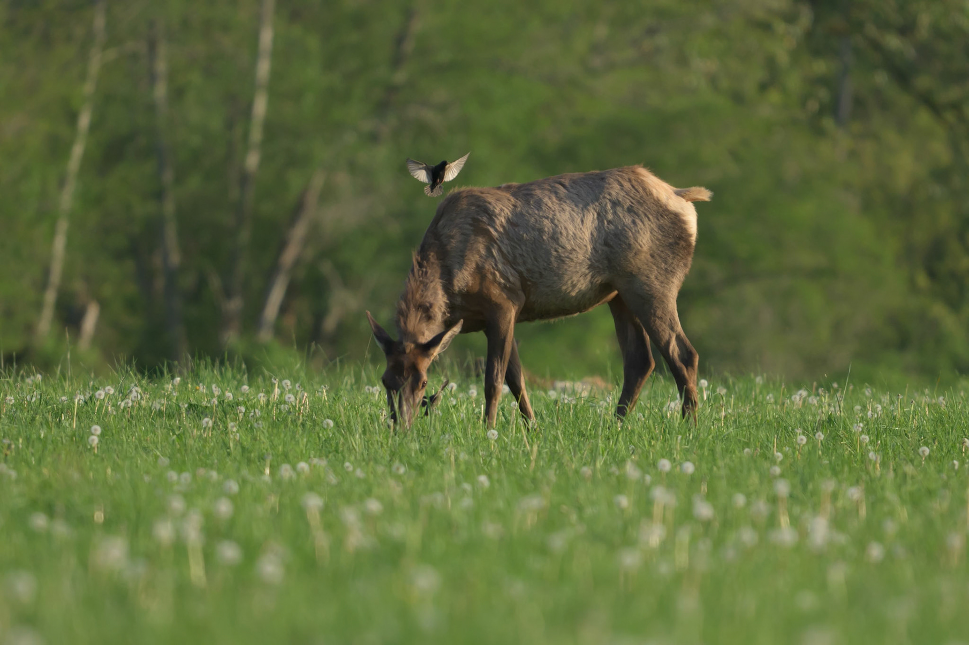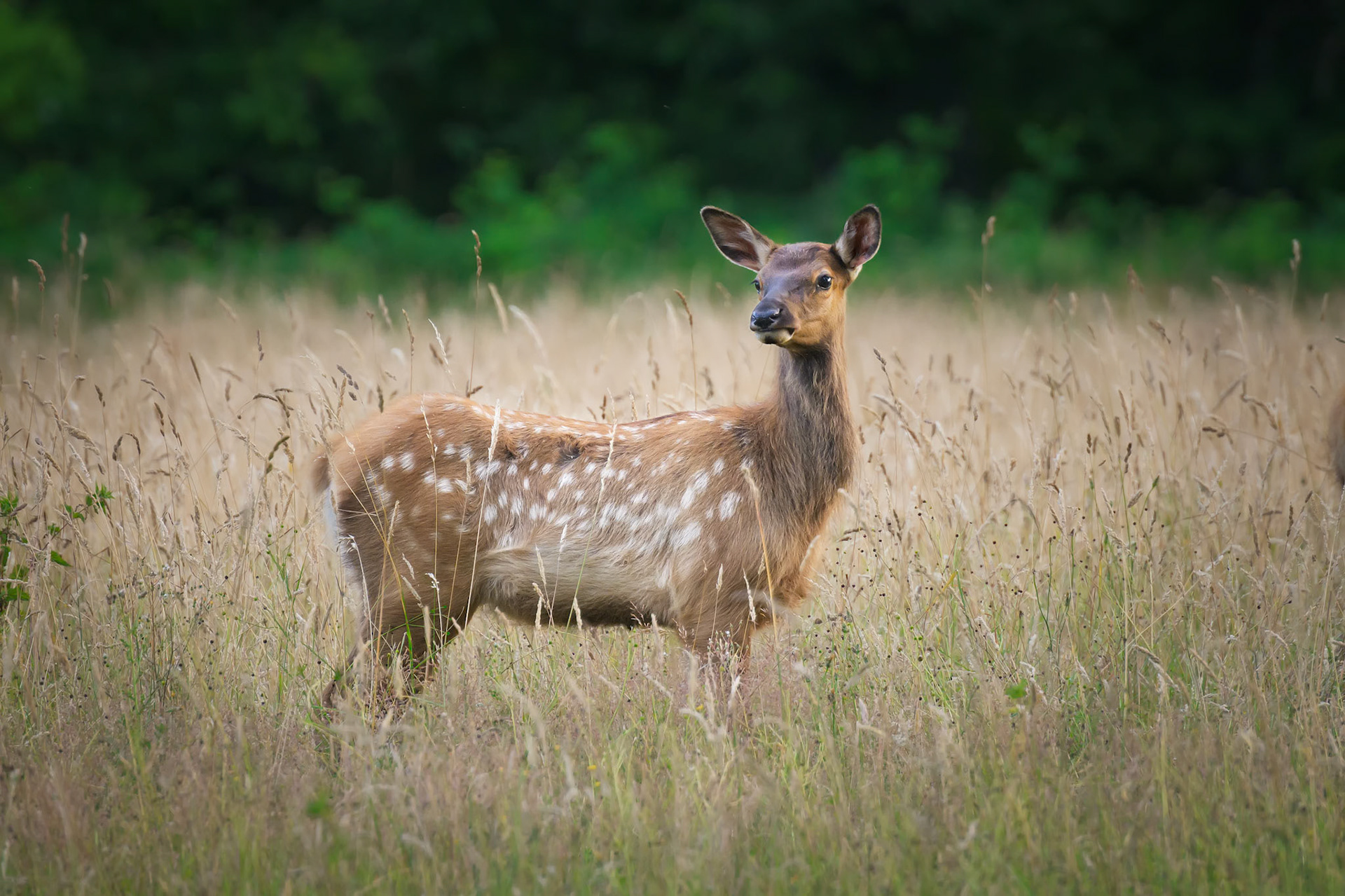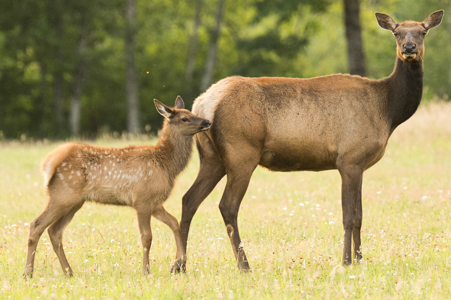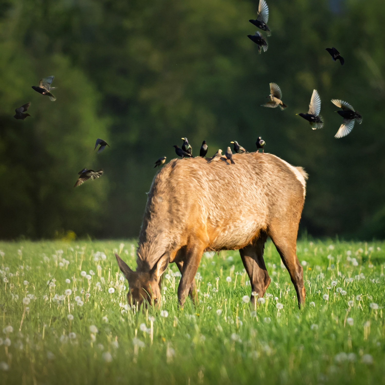 A herd of bull elk stands silently in a misty field at dawn, their velvet-covered antlers silhouetted against the soft blue haze. Captured in the stillness of early morning, this photograph evokes the quiet strength and natural harmony of these majestic creatures in their wild domain.